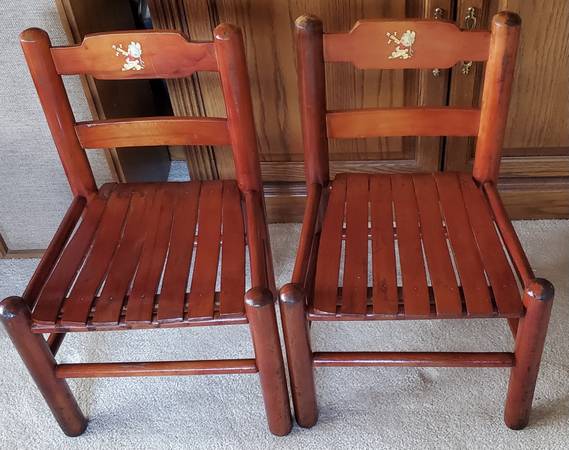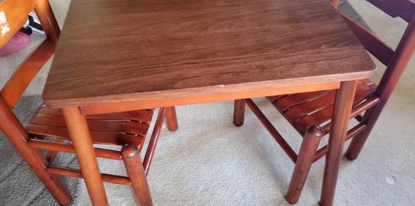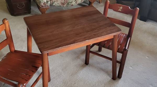 This table and 2 chairs is vintage 1950's and is in excellent condition. The table top has been refinished and the legs and chairs have been restored back to their original finish. The table top was a different type of wood so is a little darker than the chairs and table legs. It has been sprayed with a number of coats of polyurethane for maximum protection. This set was given to my niece and nephew in the early 1970's but was used by some other child in the 20 years prior to them getting it. The table and chairs are in like new condition and the decal on the back of the chairs are totally intact and are original. This would make a great Christmas present or birthday present for your small child/children or grand/children. If you are interested, please call Sharon at Seven One Nine-488-Three Seven Seven Eight. This is a land line so does not take texts. I do not respond to texts or emails and will delete this ad as soon as it is sold. Check out my other listings by clicking on the "more ads by this user" box on the right side of this ad. Cash or Zelle only! Thanks for looking!