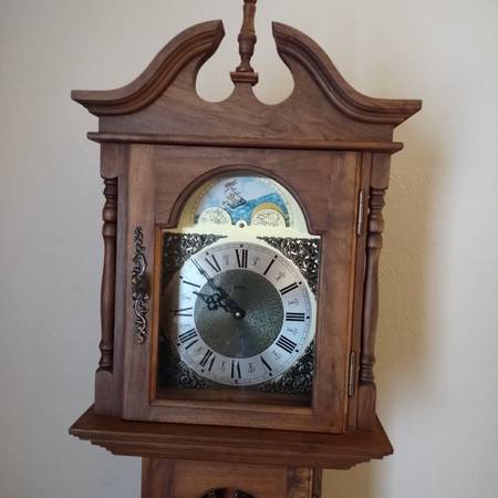 If post is up it's available 1980 grandfather clock Emperor clock company Hermle black forest Made in Germany Model number 451-050H Measures 6 ft 2 in tall Works , chimes, like it should Trade for ?