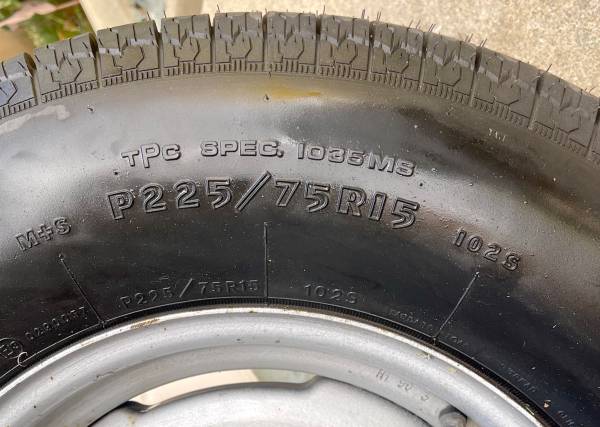 Goodyear Invictus GS Tire on wheel. Size of tire is P225x75R-15, I bought it as a spare for my trailer but got the wrong size, so the tire is unused. Wheel is 5-lug x 4.5 BCD which is the most common for 5-lug trailers and many campers, i beleive this is also the same pattern for Jeep, many Honda and others, but buyer would need to verify. Tire alone sells new for ~$175. Make me an offer or trade for;