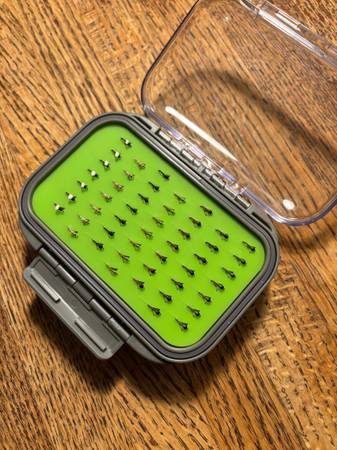 I have 49 new hand tied flies with a new double sided silicone insert fly box ready to go for winter fishing: -(7) size 20 black foam wing emergers -(7) size 20 rainbow warriors -(7) size 20 black...