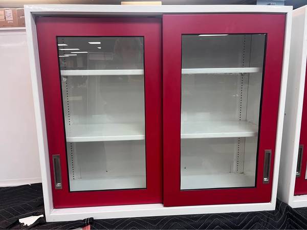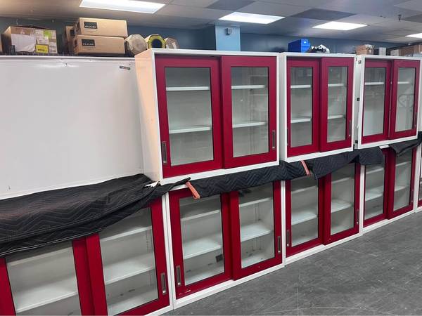 Recently removed from a local school setting Quality Fisher Hamilton Metal Hanging Wall Cabinets Multiples available at $150 each 36 x 12 x 31