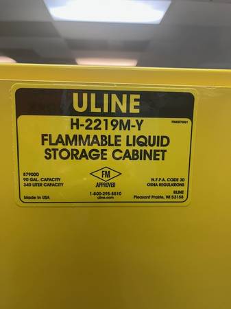 NEW Uline Flammable Liquids Storage Cabinet. Complete with key and 2 adjustable height galvanized metal shelves. Stay compliant with OSHA, the EPA and the Fire Department. Lots of storage for paint,...
