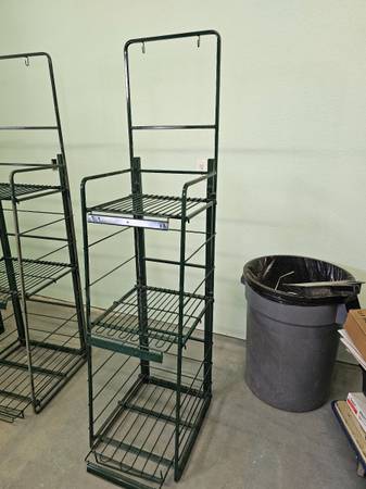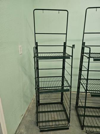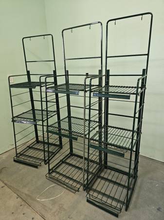 Wire store display shelves. Fold flat Hunter Green 51 inches to top of rack 69 inches tall to top of removable sign hanger 2 large, $75 each 21 inches wide lowest shelf 22.5 inchs deep middle shelf...