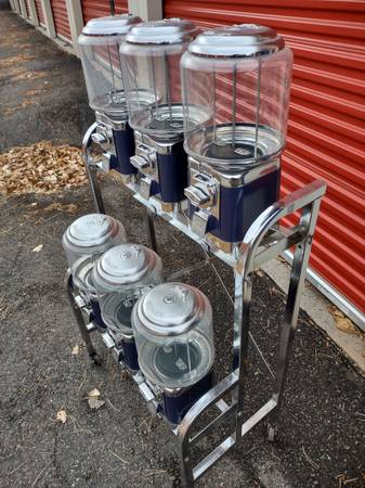 Bulk rack with 6 refurbished beaver machines with new locks fitted. Clean and ready for candy, nuts. Vends with 25 cent quarters. Perfect for entryway or lobby