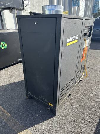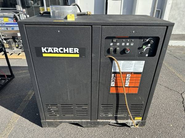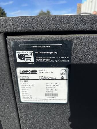 GREAT CONDITION STATIONARY NATURAL GAS HOT WATER PRESSURE WASHER, 4 GPM @ 2200 PSI, 208-VOLT / 3-PHASE / 18-AMP; 2017 MODEL WITH 9442.4 HOURS.