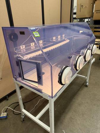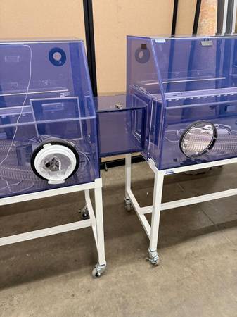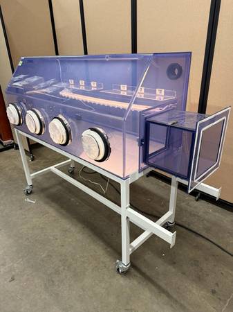 We have five of these Cleatech isolation laboratory gloveboxes available ($1500 each). Each includes 4-ports. They're used, but in very good condition. They're made with static dissipative PVC, and each includes a static dissipative transfer chamber as well.