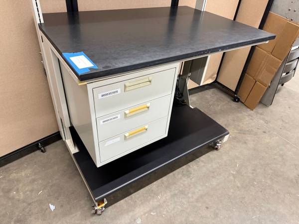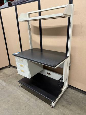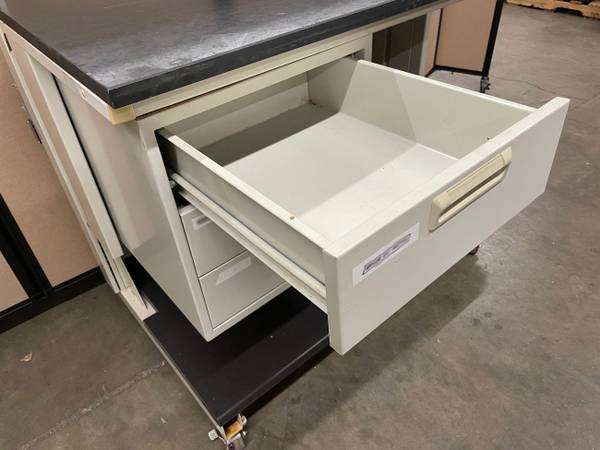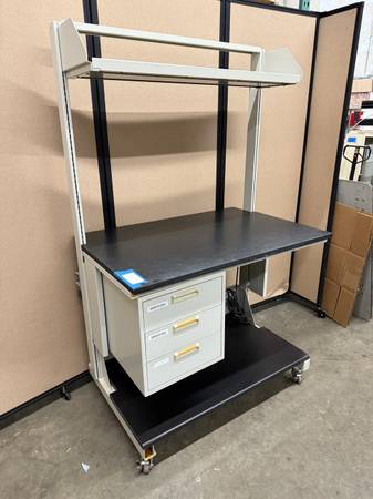 We have two of these lab workbenches available ($500 each). They're used, but in both in good condition. They're very well built - very heavy duty. They each have a chemical resistant epoxy resin top for the main work surface, and a wood laminate shelf on the bottom. They have locking wheels for easy mobility and stability. Dimensions (total): 48"W x 31"D x 79"H - (overhead shelves): 47"W x 18"D. The main surface is adjustable up/down in 1-inch increments. The shelves are 8"H each. The upright posts extend 42" above the main work surface. Photos below show various configurations, but here's how our remaining benches are currently configured:
