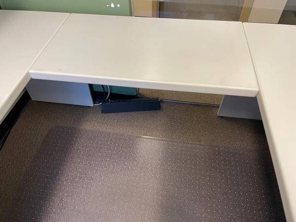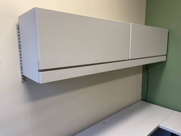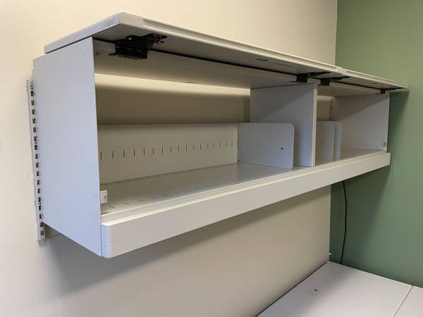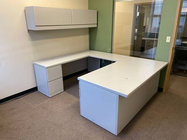 This U-shape desk set is used, but in excellent condition. It includes the main desk, bridge, the credenza behind it, and the matching wall mount overhead flipper door. This set gives you TONS of storage space, with both the desk and credenza having full height drawer assemblies (3 file drawers total). The overhead shelf gives you even more space if you need to store manuals, books, etc.