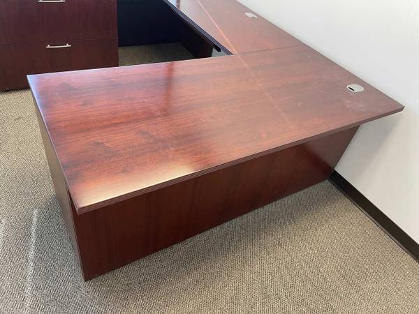 This mahogany u-shape desk set is used, but in good condition. It has a few scratches here and there, and some wear, but we can use some scratch cover and wood oil on it, and it should really shine and look very nice. It has a very nice looking finish, and the handles are silver metallic. It has a nice looking reeded edge as well. Dimensions: (total): 72" x 96" - (desk): 66"W x 30"S - (bridge): 42"W x 24"D - (credenza): 72"W x 24"D.