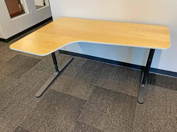 This maple desk is used, but in good condition. It has a nice looking maple laminate top, and black metal frame. The height is adjustable. Dimensions: 63"L x 43"D (21" across).