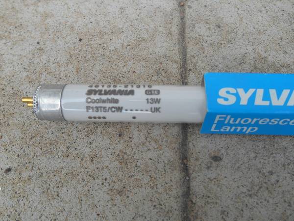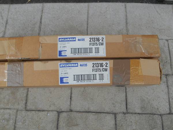 39 pieces brand new in original packaging Sylvania F13T5 CW fluorescent tubes model # 21316-2, properly stored indoors and laid flat, still a current spec at HD with their price of $11.50 each but my price is $5.00 each singly or $125.00 for all 39, call/ text Doug