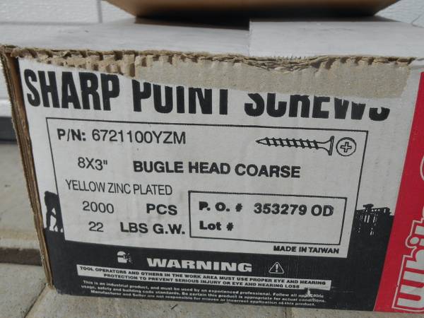 About 3/4 of a full box ( 16 lbs. ) of #8 x 3" yellow zinc coated Philips head sheet rock screws, only been stored dry indoors, HD wants over $30.00 for a 5 lb. box of these, so my price is a bit...