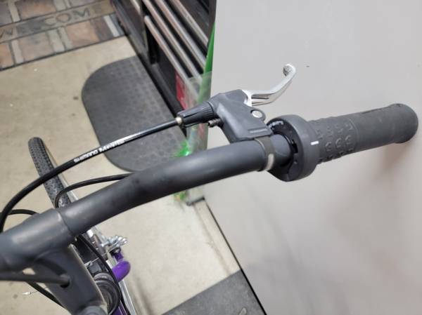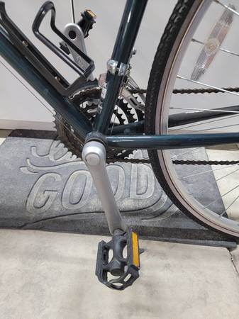 21 speed (3 x 7) bicycle with hybrid tires, bottle rack, upgraded Avenir seat, center-pull caliper brakes.