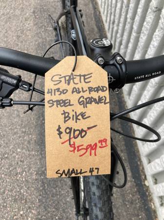 State 4130 All Road - was $899.99 now $5999.99. Fantastic Chromoly steel frame, this bike is an excellent gravel bike or commuter bike. Big tire clearance with plenty of rack and accessory mounting points and cable actuated disc brakes for tremendous stopping power. The Chromoly steel frame gives a great ride feel with a 11 speed drivetrain this bike is capable of anything!