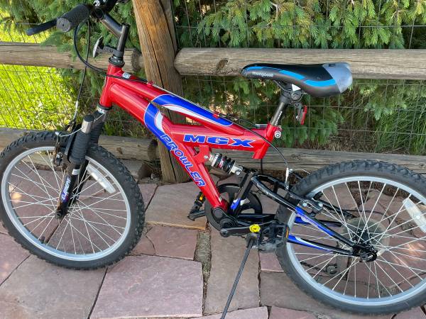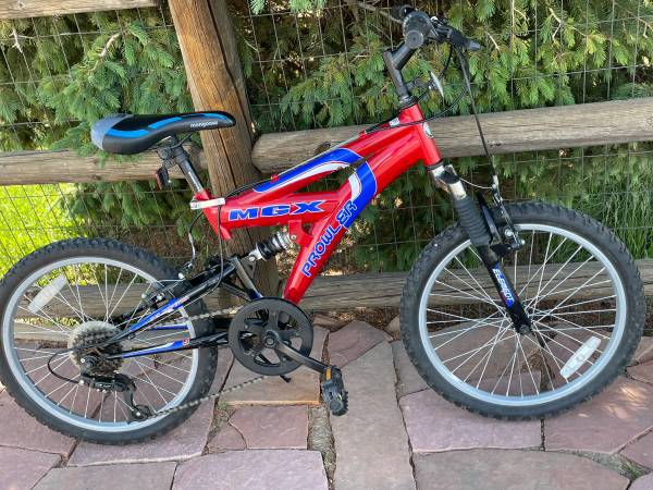 red Mongoose MGX Prowler mountain 20” wheel bike It has front end, rear suspension, 13 inches frame, size 6 speed bike in excellent condition