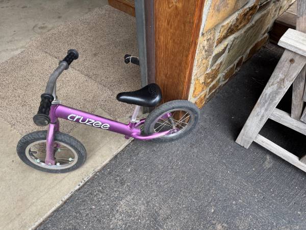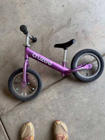 Cruzee super lightweight balance bike. Good condition and was used by our two kids. Nice thing about this one is that it weighs 4 pounds so easy to handle for any age and adjusts to ver small sizes....