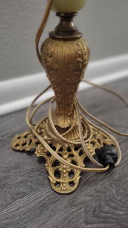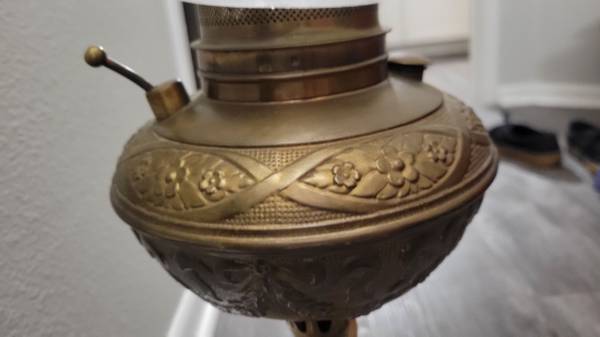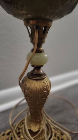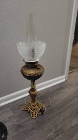 Old kerosene lamp turned into electric model. There is no damage as far as I could see. Antique original lamp. Really beautiful.