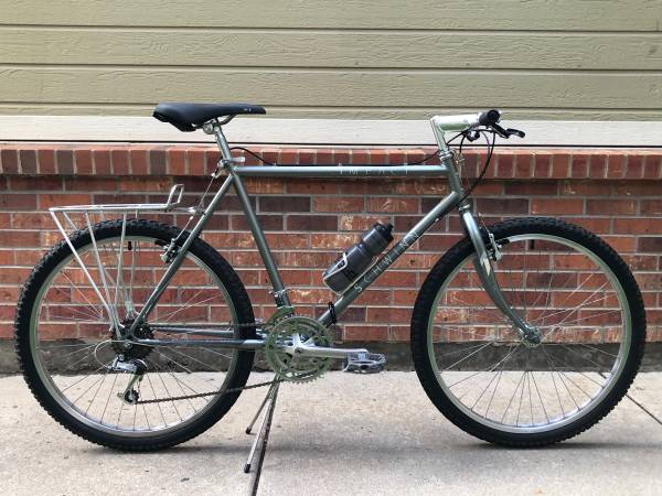 Fun unique bicycle! The build started with the Schwinn steel frame and forks. Then a combination of various new used as well as new parts were used to create the bike. It includes new grips, seat, bars, pedals, brake levers, brakes, index friction shifters and new cables for brakes and shifting. Totally clean new custom build with a vintage twist. The frame and forks have scratches, rubbing and use marks but has been cleaned. Rides great and is ready to enjoy. Water bottle not included.