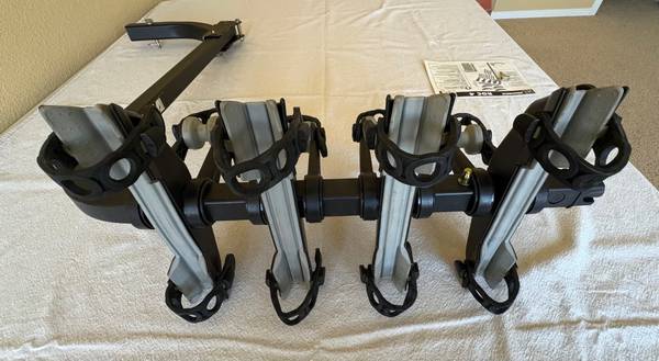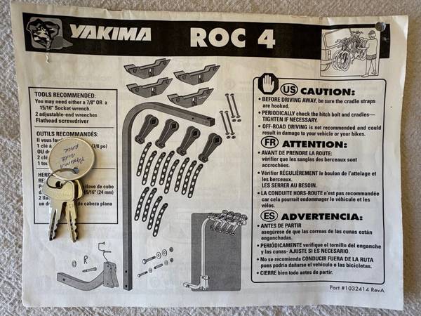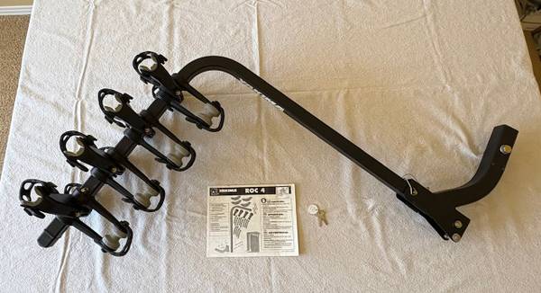 Yakima ROC 4 bicycle rack. Holds up to four bicycles although rack can be adjusted to hold less if desired. Original owner. Extremely good condition, used only a couple of times. All straps intact. No major scratches or flaws. Original manual. Has locking strap and two keys. Fits into standard 2" hitch. Folds down to allow access to rear cargo area of vehicle.