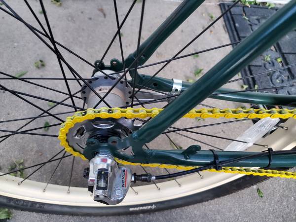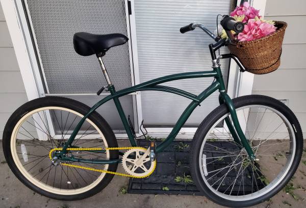 It’s time for a 3-speed townie bike with a wicker basket. This bike has a Shimano three-speed internal rear hub. The bike is perfect for bike paths, cruising to the coffee shop and riding around town. Are you ready for the local cruiser rides? It's your chance to buy a unique bike for riding with your friends. The frame was completely stripped and repainted in a cool dark green color. It was almost never ridden after the custom rebuild and only has a couple small nicks and scratches from very light use. Wicker basket on handlebars, great for light shopping. Brand new yellow chain and of course a kickstand.