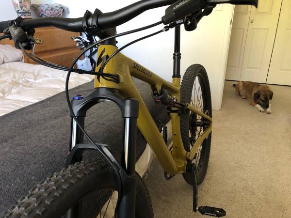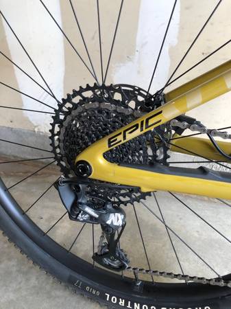 Specialized Epic Evo dual suspension harvest gold/black frame size medium. This mountain bike is in mint condition like new with a carbon fiber frame, Rock Shock front and rear suspensions, hydraulic brakes and seat dropper. I had a Ride Wrap (clear lizard skin protective wrap) done on the frame right after I bought it. I just had the rear brakes bled and installed new pads. Other than the tires, this bike has never touched the ground and is like new.