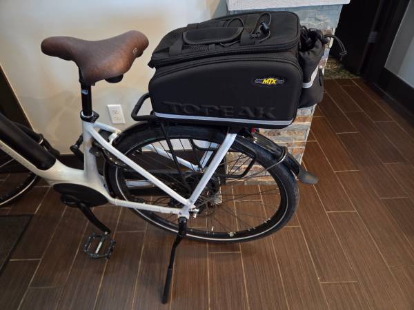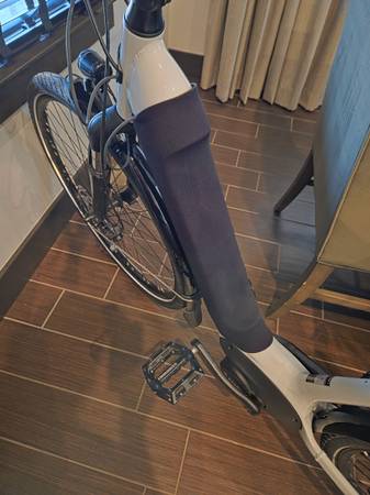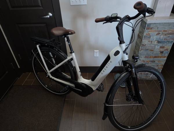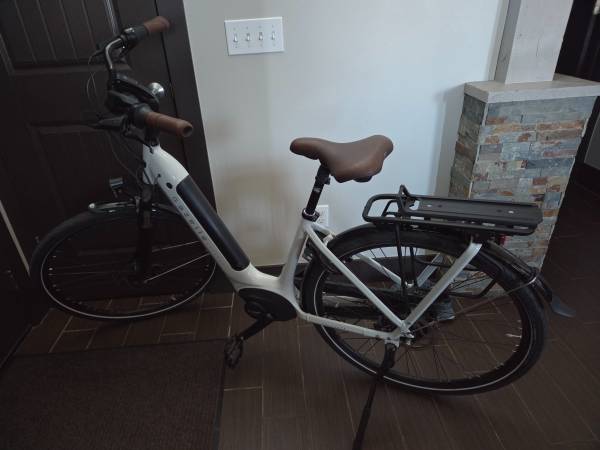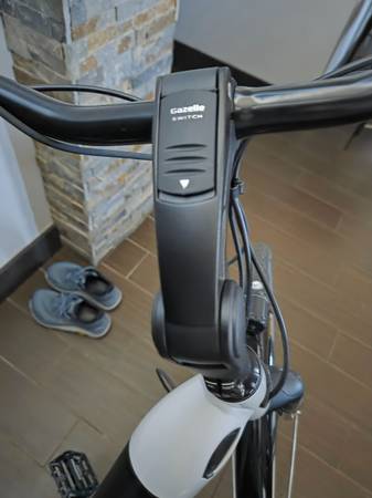 Like new condition. One owner, purchased 2 years ago but ridden only 6-7 times. Easily adjust handlebar height and distance with Gazelle Switch handlebar adjustment. Front fork and seat suspension. Front light and taillight. Medium (53 cm) frame fits 5'6" to 5'10".