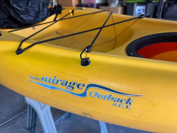 2011 Hobie Mirage outback SUV kayak is pretty sweet and in good shape and has only been in freshwater. This boat is very stable, 13 feet long and has both the mirage foot pedals and a Hobie kayak paddle along with the awesome one hand steering rudder. I've replaced the seat (brand new) and it has built in storage. The bungees have been just replaced as well as the bow and stern cary handles.