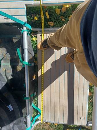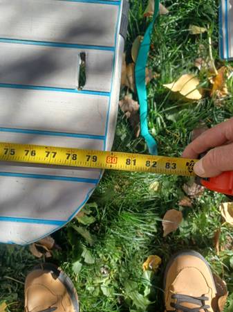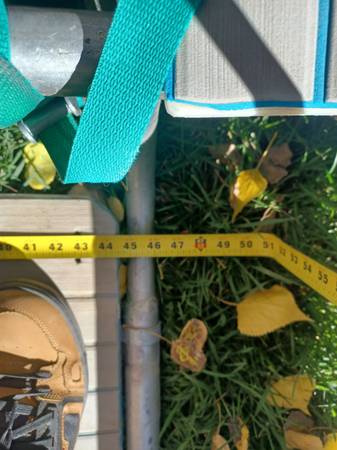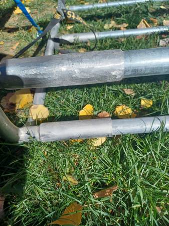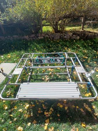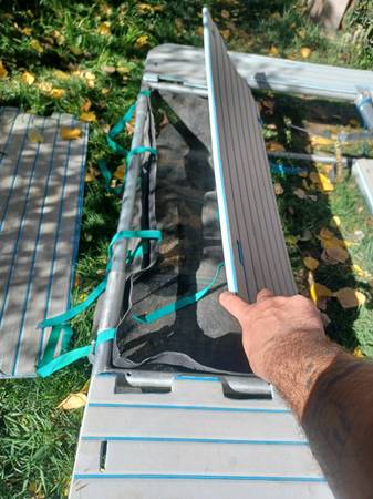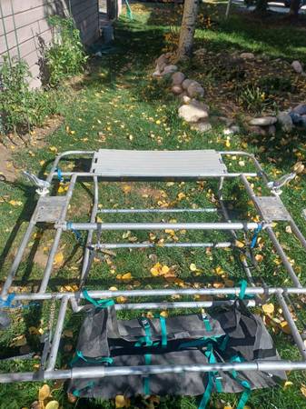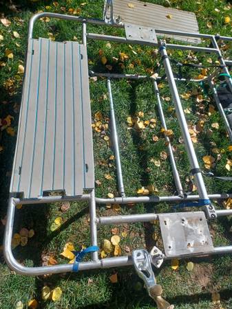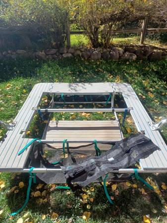 4 Bay Raft Frame. This is a breakdown frame, the inner crossbars are removable making it adjustable in width to fit a variety of rafts. Has drop down rails so it can work for a cataraft too, also has deck board in center bay(cockpit) which is very sturdy and comfortable. It is 80" in length, and currently set at 74" wide on the top, with 46" width for the drop down rails, however the width can be changed to fit inside almost any raft. The front and rear bays measure 14" x (anywhere between 36"-44") depending on the crossbars you use or need to accommodate your raft. The Large cooler bay has been used for my yeti 160qt comfortably but can fit any cooler you have. All the decking is included, HDPE with sea deck foam overlay, front hatch interlocks with sides to make a sturdy platform to walk on. (Comes with extra shorter hatch too, to fit a narrower setup). Also comes with (2) 14×44 mesh drop bags, and one with the zipper top enclosure. Oar towers included, but not the oarlocks themselves(I'm keeping those). Also comes with extra piping for crossbars to shorten the width. This has been a great multi-day setup, and day trip rig as well.