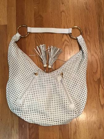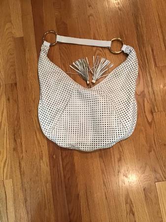 Brio! White leather over the shoulder purse. All zippers work and leather is white and gold is shiny. 17” x 12” plus strap. Asking 10.00 obo.