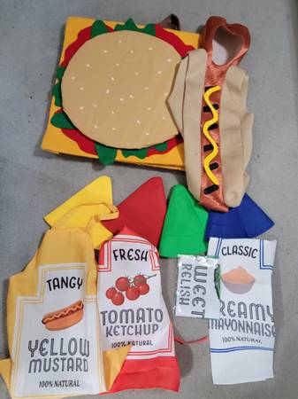Includes Ketchup, Mustard, Mayonnaise, Relish (never worn), Hamburger, and Hot Dog. Everything is one size fits all. The Hot Dog would be best for 4- to 10-year-old. Great deal! Cash only.