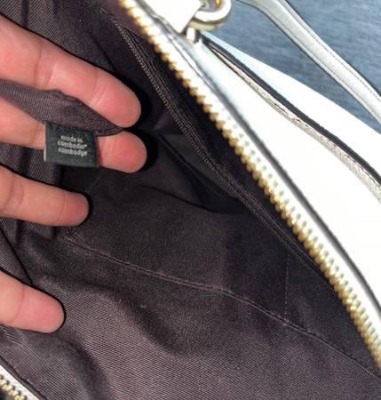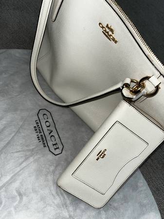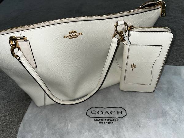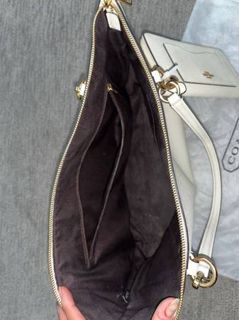 •Coach tote - beige, gold zipper at top, brown inside, zipper pocket inside, pockets inside, pocket outside.
