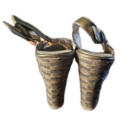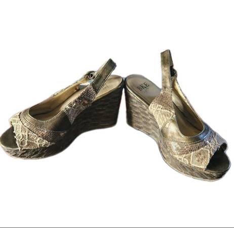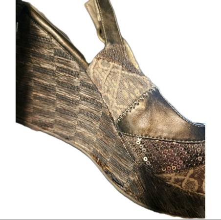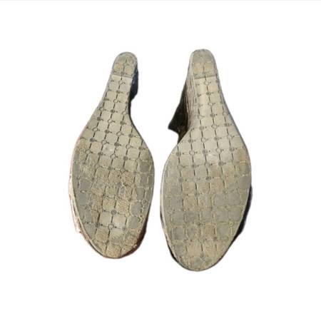 Good used condition. Small spot where the shoe glue leaked onto the left wedge heel. Wear to soles (including staples from price tag I believe). Comes in original box.