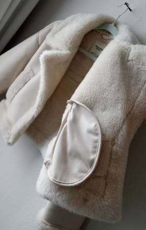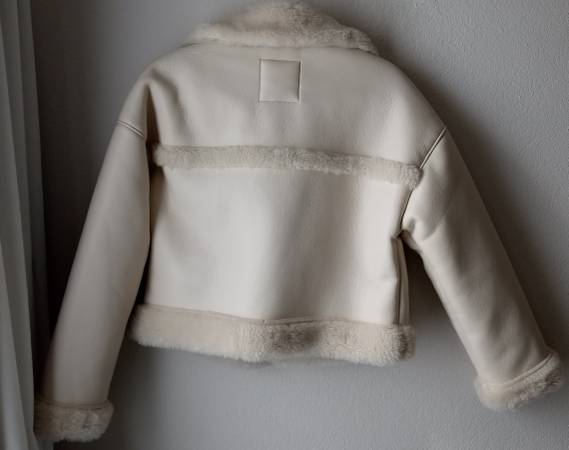 This snuggly warm coat is gorgeous Cream color Vegan Leather exterior. It has Faux Fur Lining. The pockets and sleeves has faux fur accents as well as the back and bottom edge. The collar is wide and snuggly, Bomber Jacket style. It has two snaps front enclosures. Size XS that actually fits more like a small.