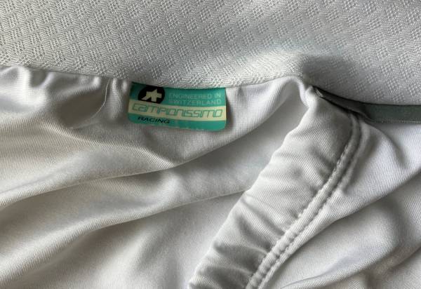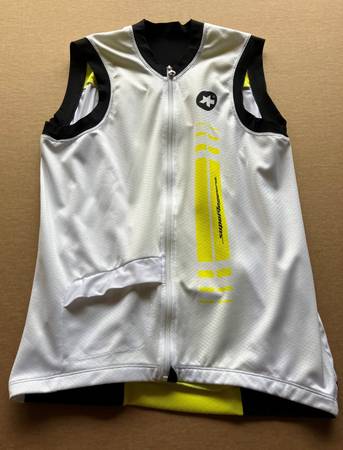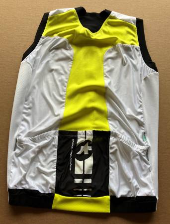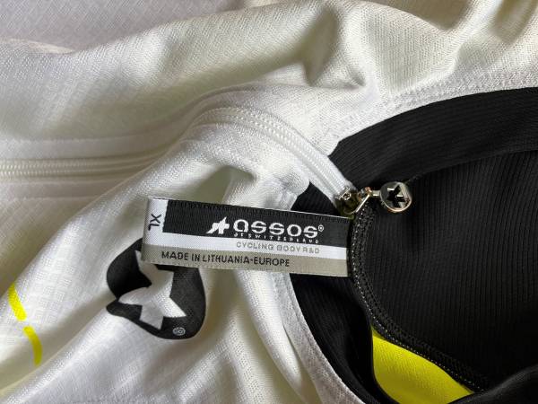 White w/yellow accents, side pocket, three rear pockets. Almost new. Was worn 2 times. Designed in Switzerland. Made in Lithuania. Size: Men's size Assos XL (check Assos website for size...