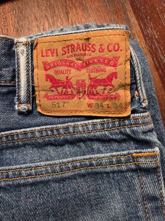 5 Pair of Levis, size 34"W X 34"L. Previously worn but good condition - no holes, stains or tears. Styles are: 3 pair 505s, 1 pair 517, 1 pair 559. Jeans appear lighter in photos but jeans are faded...
