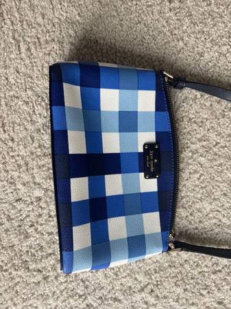 Kate Spade blue white black checkered small crossbody leather bag. Like new condition. $40. Estimated measurements: height 6.25", width 8.5", depth 3". Call or text if interested.