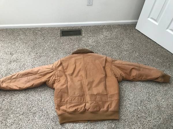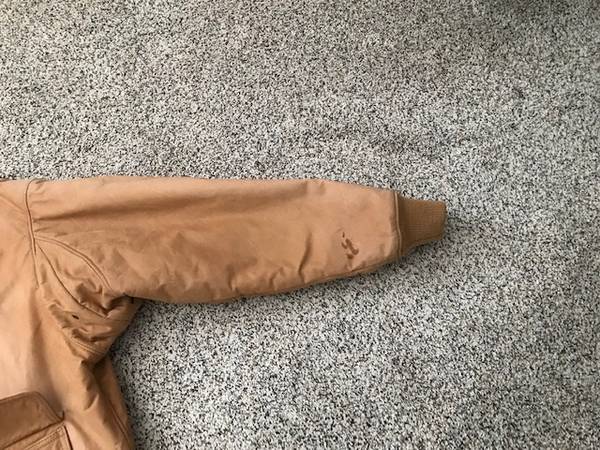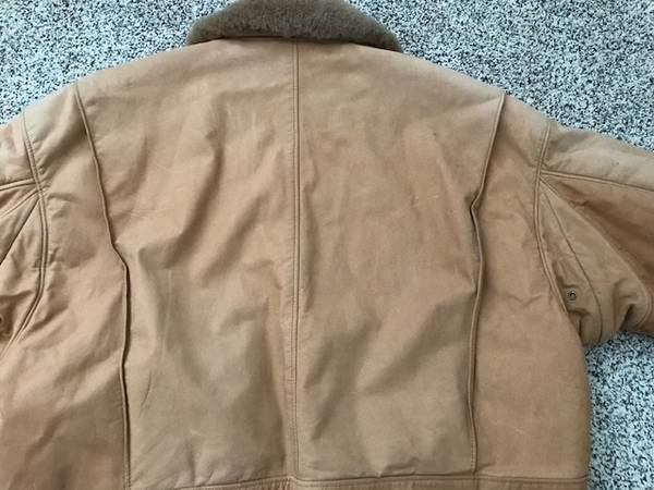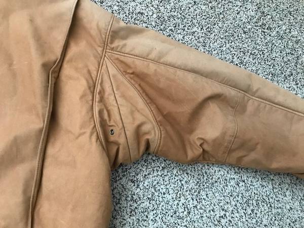 Wasn't worn very often, however, there is some fading under the pocket folds and some staining on the bottom of one of the sleeves. Lining is in very good condition and has an inside pocket as well as air vents under the arms.