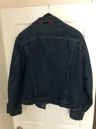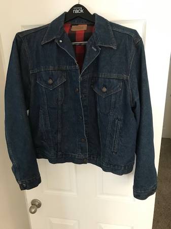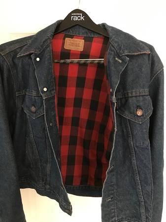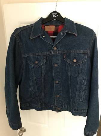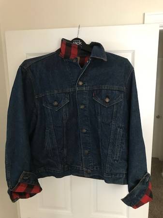 Selling a Levi's Trucker Jacket. Red and black buffalo plaid check lining. Double row stitching by button hole, handwarmer pockets, little “e” on tag. Excellent vintage condition (no holes or stains). Non-smoking household. Size is 48L.