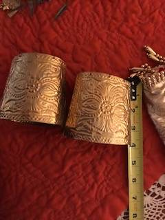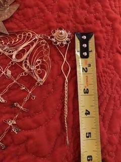 Red Woman's Top and Sarong for Skirt (Gold Filigree Baroque), Woman's Headdresses (2), Man's Headdress, Wrist Bands (2), Necklace, Hair Pin with Dangles (2), earrings.