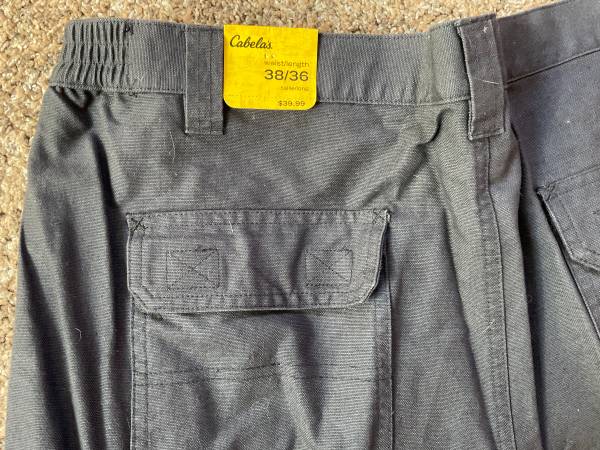 New, with tags. A pair of Cabela's classic fit pants in a men's size 38 x 36 in the color gunmetal.