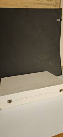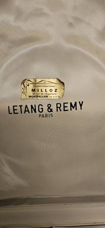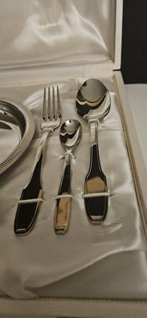 Antique Letang and Remy 1930's French Christening/Baptism 8 piece boxed gift set. The vintage white hinged and locking box is lined in white satin and has the Letang and Remy logo on it, as well a sticker from the store it was bought at in Montpellier, France. The set appears to never have been used, although the outside of the box has wear and some stains on it. The set consists of one plate, 4 utensils, 2 cups and a napkin ring.