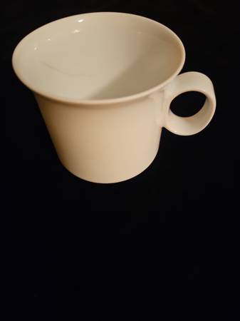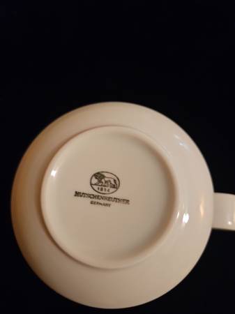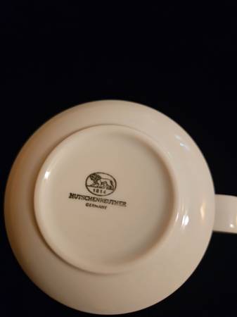 Delicate white china cup in perfect condition, only 3" high and 4" across including oval handle. Made in Germany, clearly marked in green ink on bottom, the 1814 lion and Hutschenreuther, Germany. $3