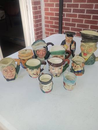 All of these great collectibles for $30 cash. Three decanters, all Toby mugs shown, and the old measuring cup. Most of the Toby mugs were made in Japan in the late 1940s. Everything goes together. Come and get them. Keep checking back, as I will have more collectibles that I am getting rid of. Best way to reach me is to call me. Thanks for looking.