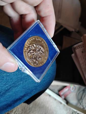 bronze, 1.5"-diameter medal in blue holder in .375" x 2.125" x 2.25" hinged, hard clear plastic case
