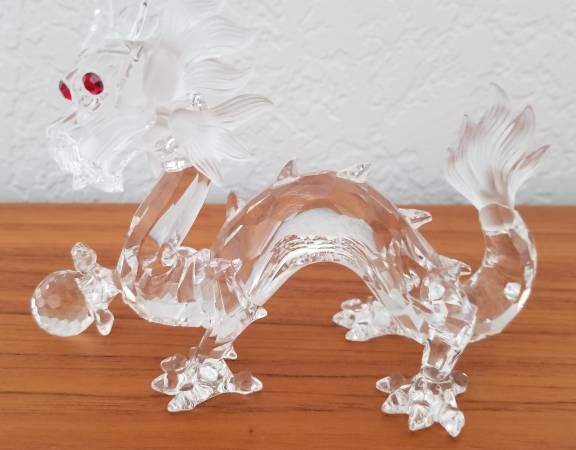 $240 – Dragon – 1997 Members piece - Fiery Red eyes. Frosted crystal mane, whiskers, and tail. Right paw is pushing a ball.