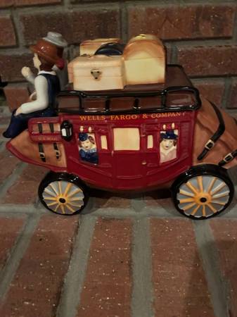 Have 3 ceramic Wells Fargo stagecoach ceramic cookie jars. Lid is the luggage on top. Never used, in new condition. $30 each cookie jar.