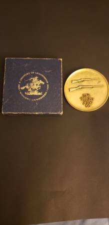 3 inch bronze medal from medallic art co. depicts horse and rider on one side with the words "a century of leadership 1866-1966. other side depicts rifles with words" the return of the '66" comes...