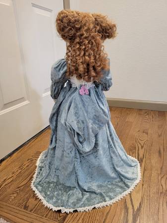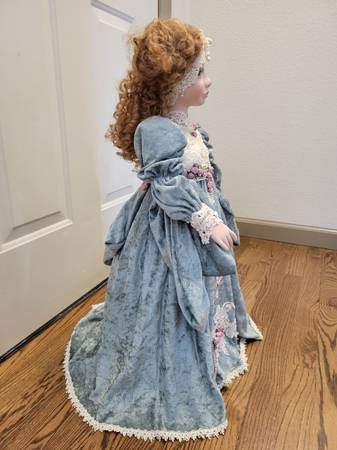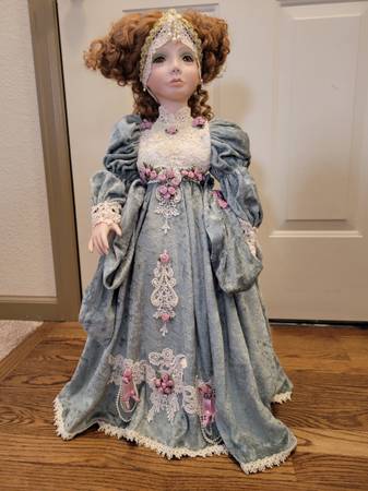 Theodora looks as though she just walked out of Camelot. Her lovely face is a Patricia Loveless original and her elegant mint green dress evokes the splendor of King Arthur's court, with its trim of lace and pearls and an intricate lace applique on the skirt. Her auburn hair is styled to reflect the period and her romantic green eyes hint that she may have suitors among the knights in shining armor. Theodora has been fashioned of the finest materials and is issued exclusively for the Designer Guild Collection in a limited edition, hand numbered on the back of her neck where the artist's signature mark is inscribed in 18k gold. She is number 0087/2000 worldwide and includes her COA, hang tag, care sheet, box and stand.