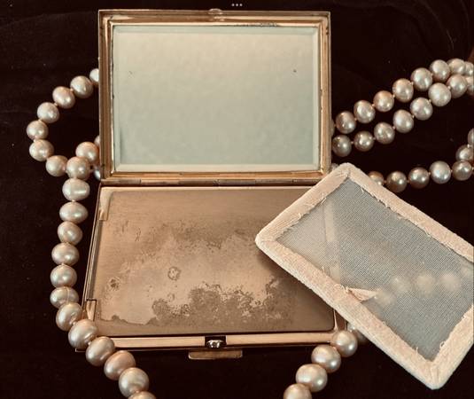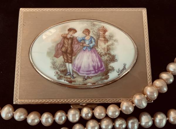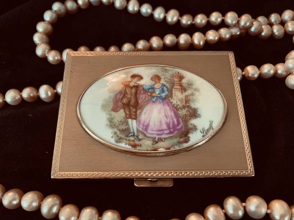 Vintage Limoges brass powder compact w/Fragonard painting from Patrys in Paris. Likely from the 1950’s, possibly the ‘40’s. The porcelain inlay with the Fragonard Limoges “courting couple” is signed. Good condition, with minor age spots on brass inside cover; has original screen. Very lovely collectible piece!