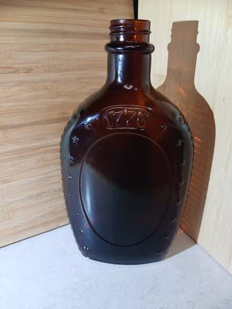This bottle was part of the Log Cabin Syrup Bicentennial promotion. There were several different versions. This one has the "Spirit of 76' embossed on it and the Log Cabin logo on the bottom. The bottle measures 8 1/2" tall and 4 1/2" wide. The bottle is in excellent condition, but does not have the original screw top.